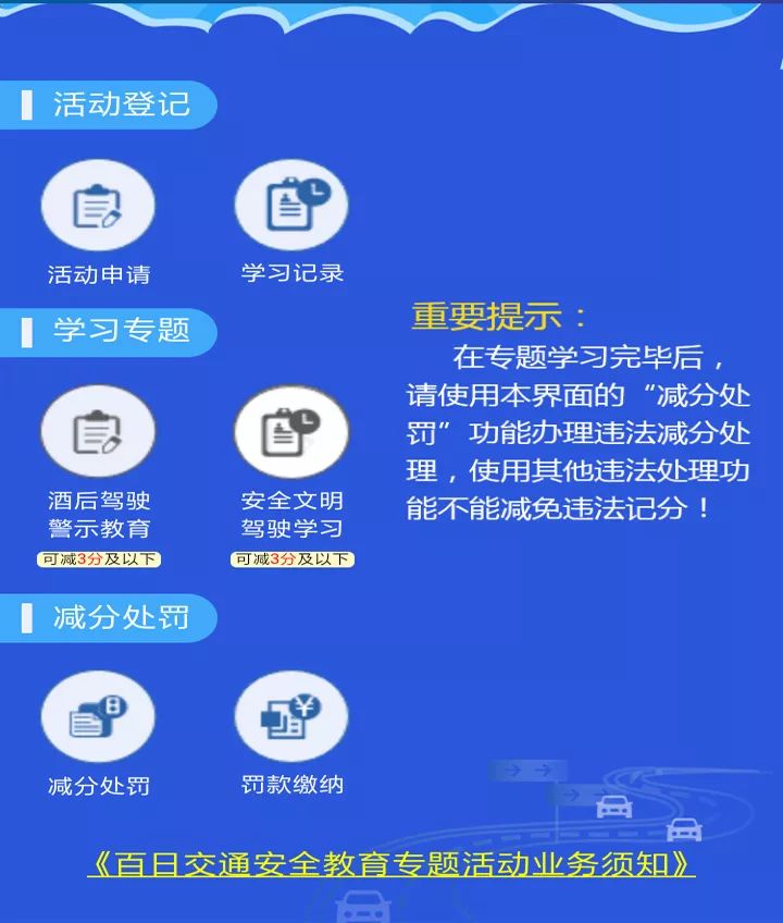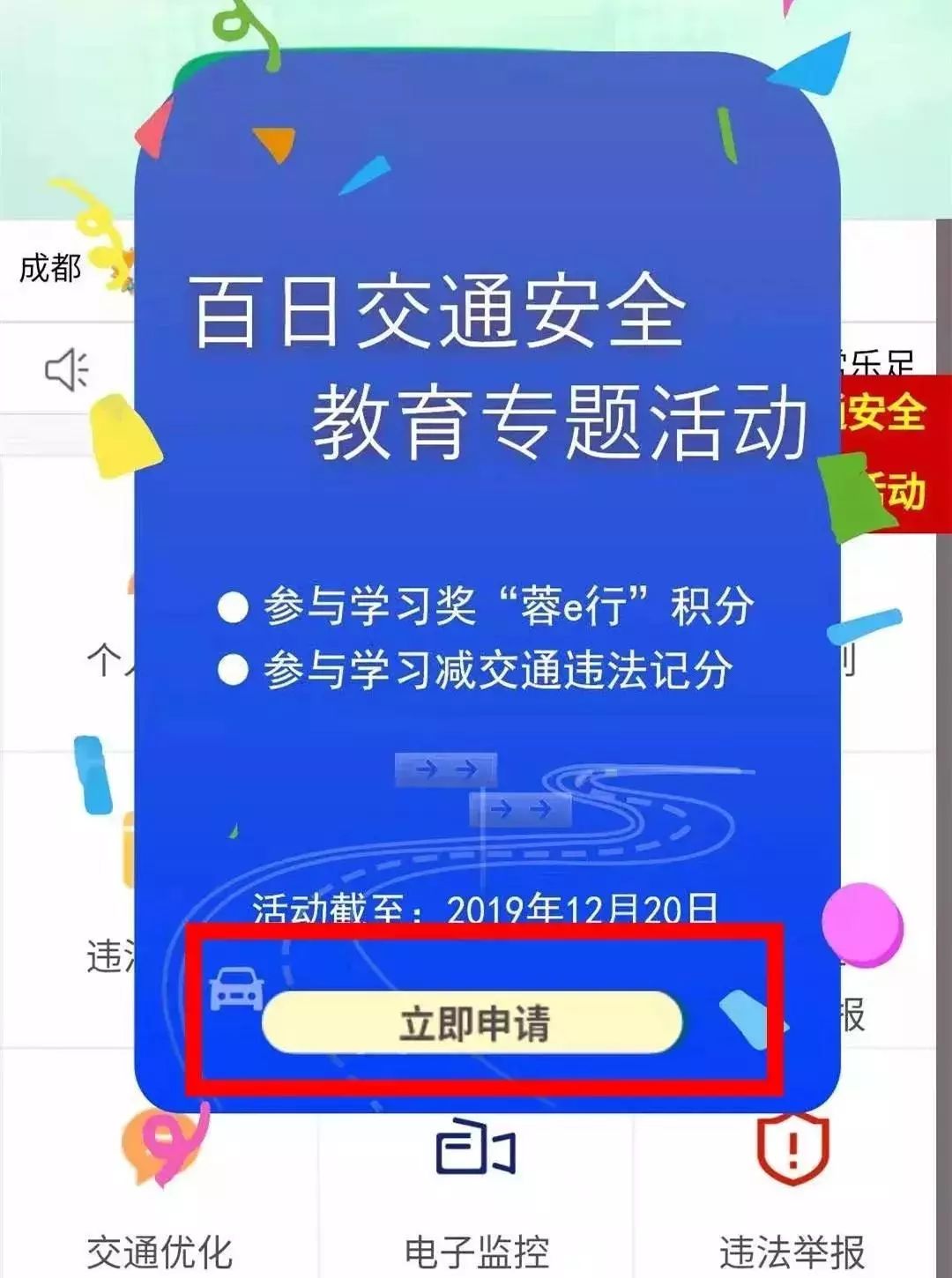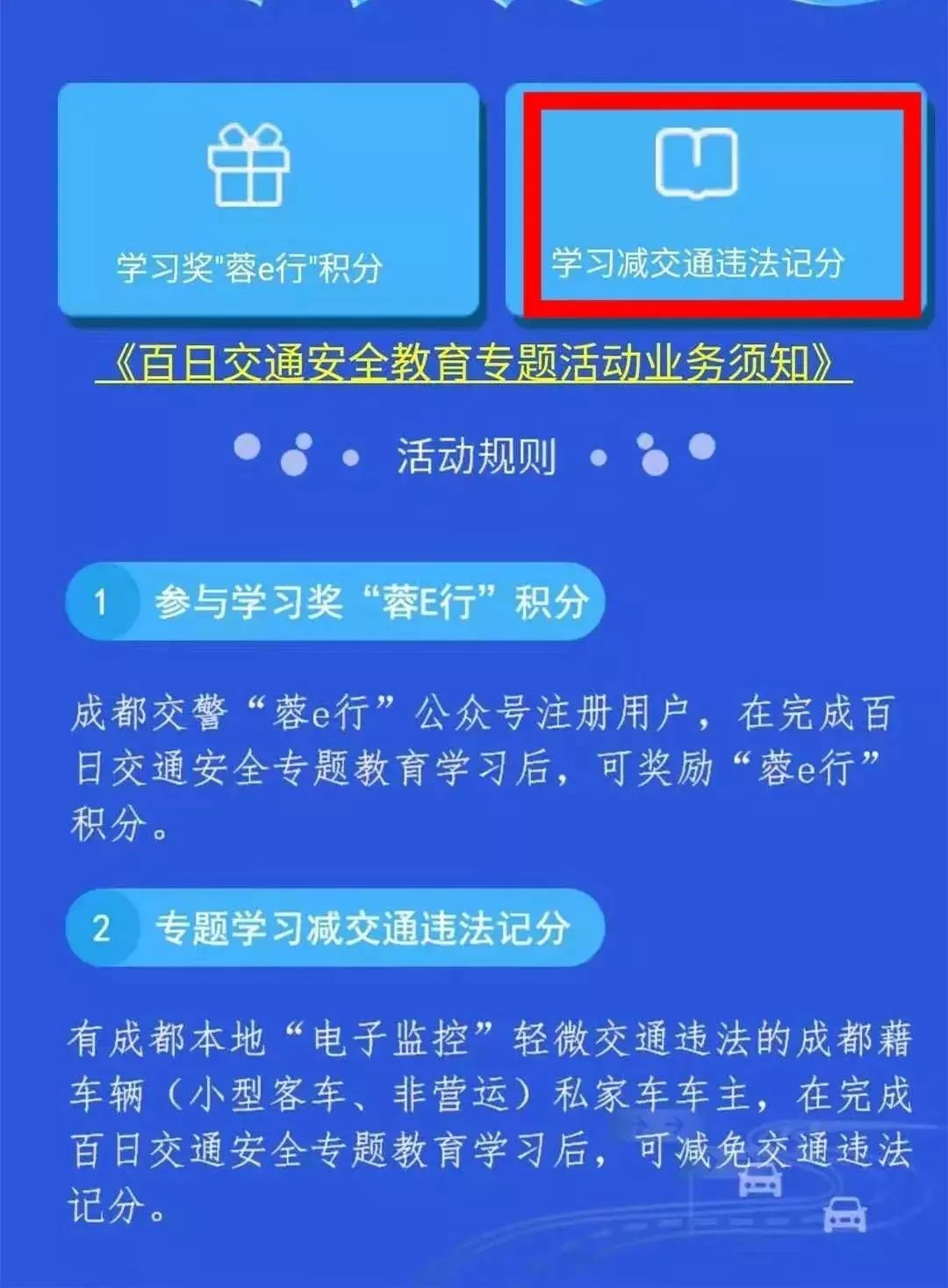 在此次道路交通百日安全宣传教育专项活动期间,可通过参加“蓉e行”平台酒后驾驶、安全文明驾驶两个方面专题教育学习,减免2次轻微电子监控违法记分。